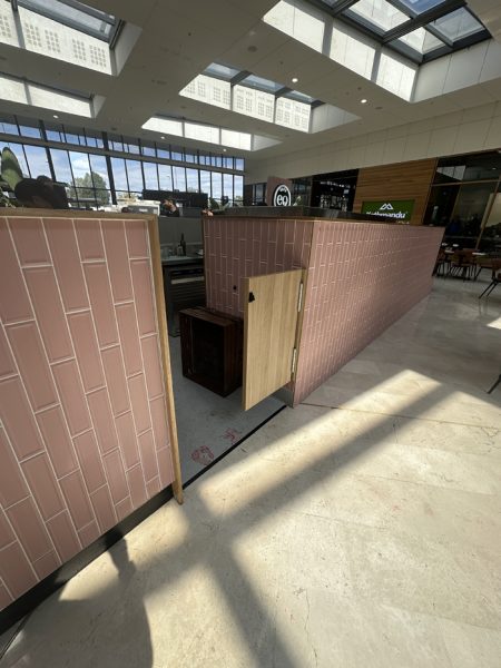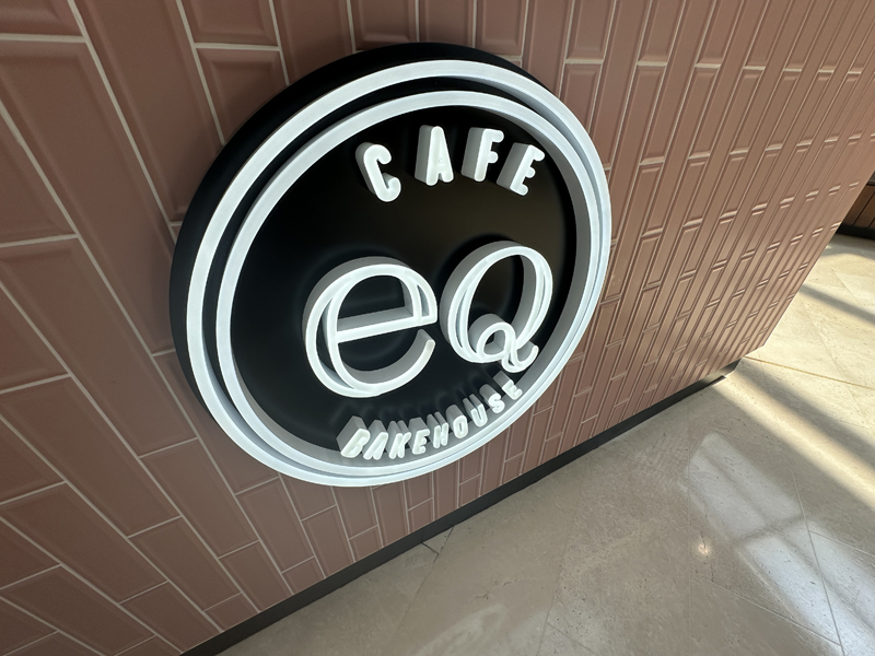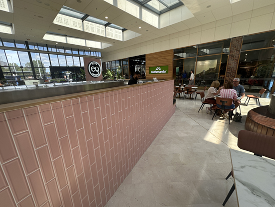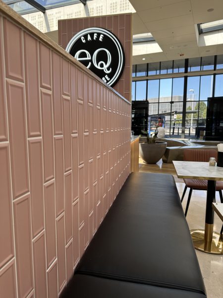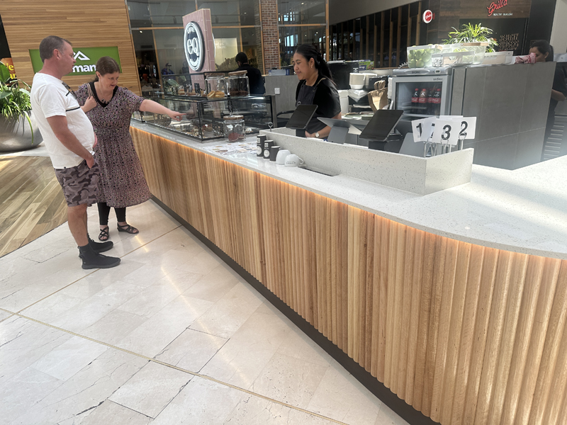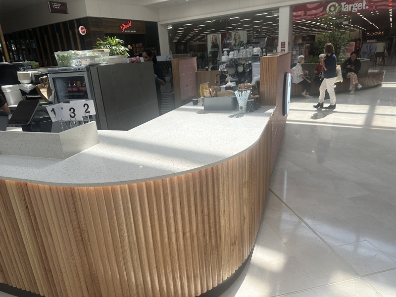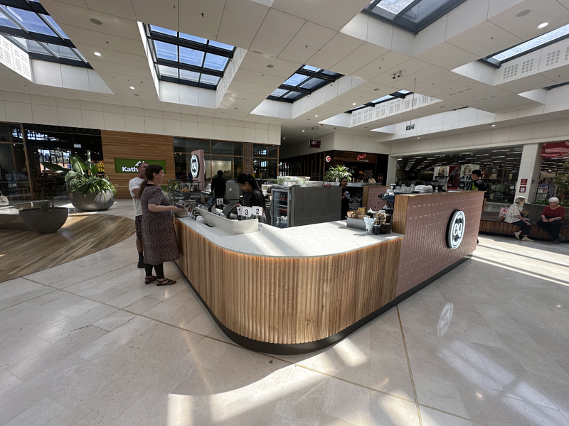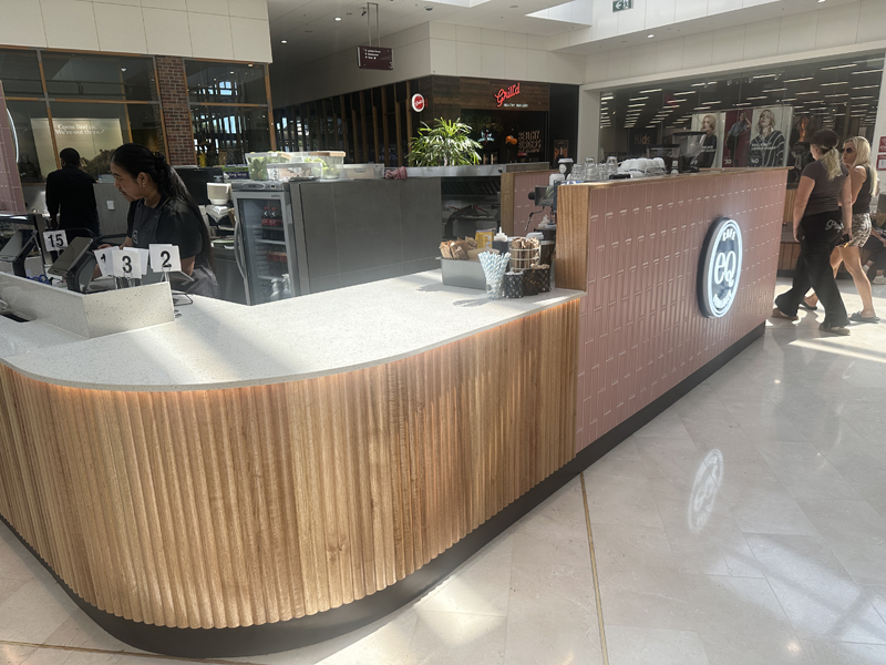 | The EQ bakehouse kiosk at westfield belconnen is a compact yet highly legible café designed to stand out within a busy retail environment. the curved counter form softens the kiosk footprint and enables strong customer engagement from all sides while supporting efficient day to day operation. A refined material palette expresses the eq bakehouse brand, combining vertically fluted timber joinery, light terrazzo bench-tops and blush toned, brick pattern tiles. integrated lighting and illuminated signage enhance visibility across the mall and reinforce brand presence. Casual perimeter seating with marble look tables and upholstered banquettes creates an inviting pause point for shoppers. The design delivers a clear balance of strong branding, material warmth and functional clarity within a compact retail footprint.
