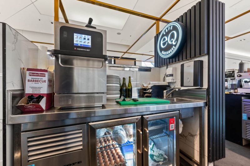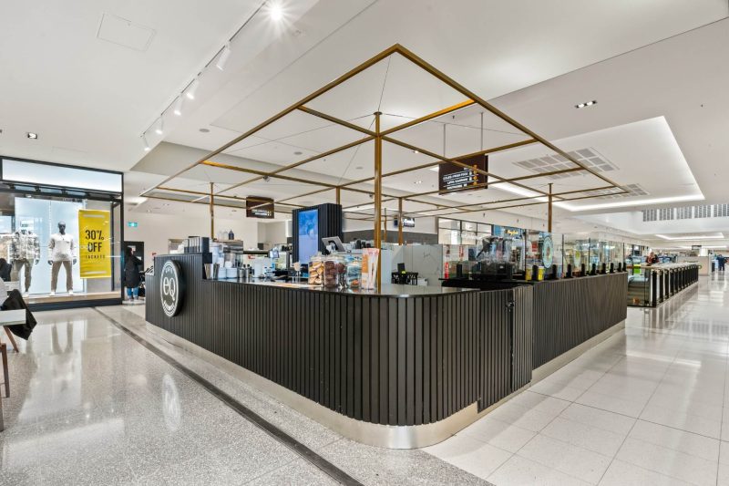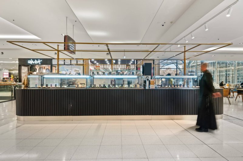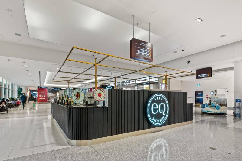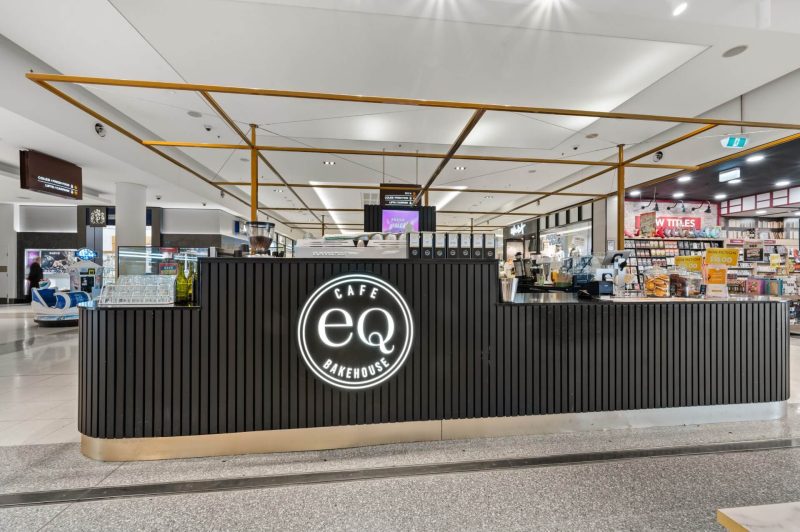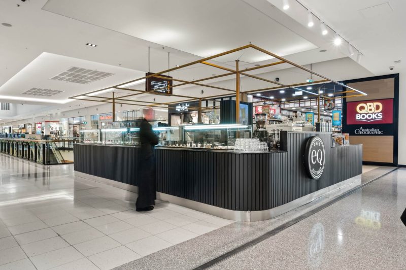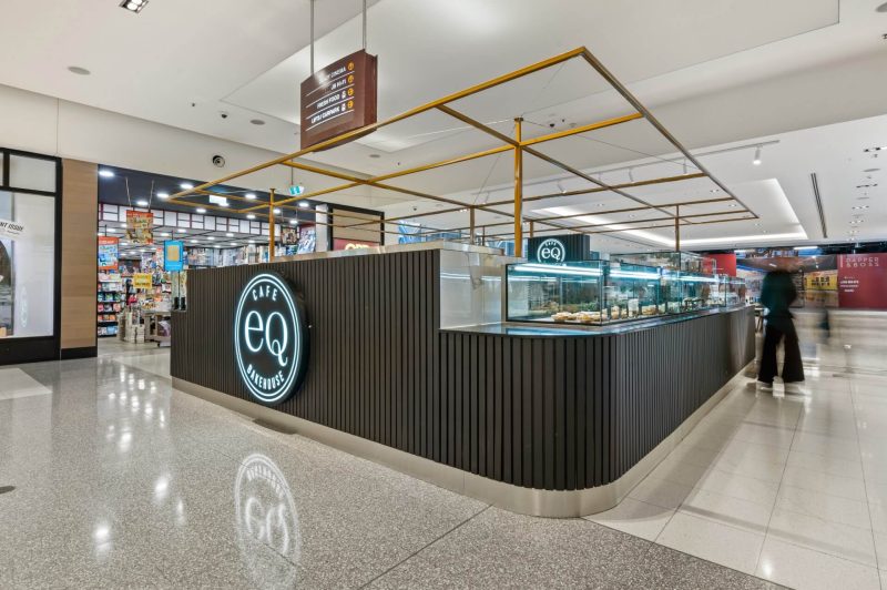 | The eq bakehouse kiosk at canberra centre is a sharp, high impact café designed for the fast pace of cbd retail life. sitting proudly in the heart of the mall, the kiosk is accessible from all sides, making it easy to grab a coffee on the run or pause for a quick bite. Bold, vertically fluted black joinery sets a strong base, paired with wrap around glazing that puts fresh baked goods on full display. illuminated eq bakehouse branding and a lightweight brass toned overhead frame give the kiosk a clear identity without crowding the open mall environment. Compact, efficient and built for volume, the layout neatly integrates coffee, food prep and display into a tight footprint. the result is a confident, standout kiosk that balances speed, clarity and brand presence—perfectly tuned to one of canberra’s busiest shopping destinations