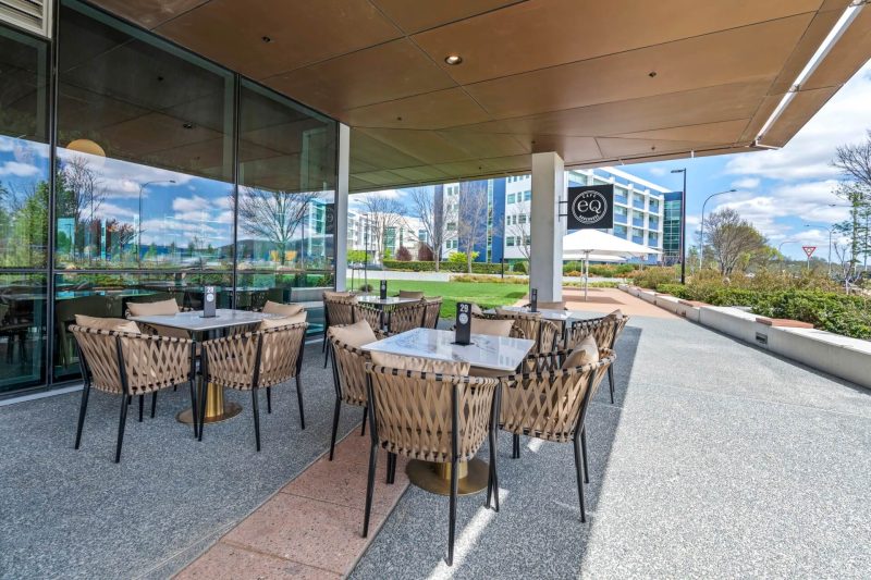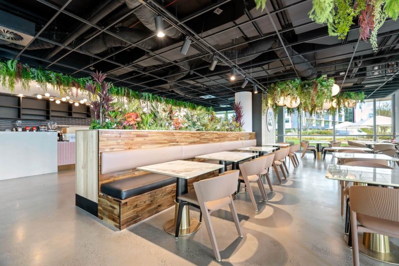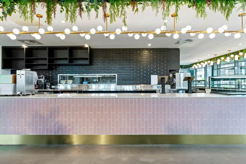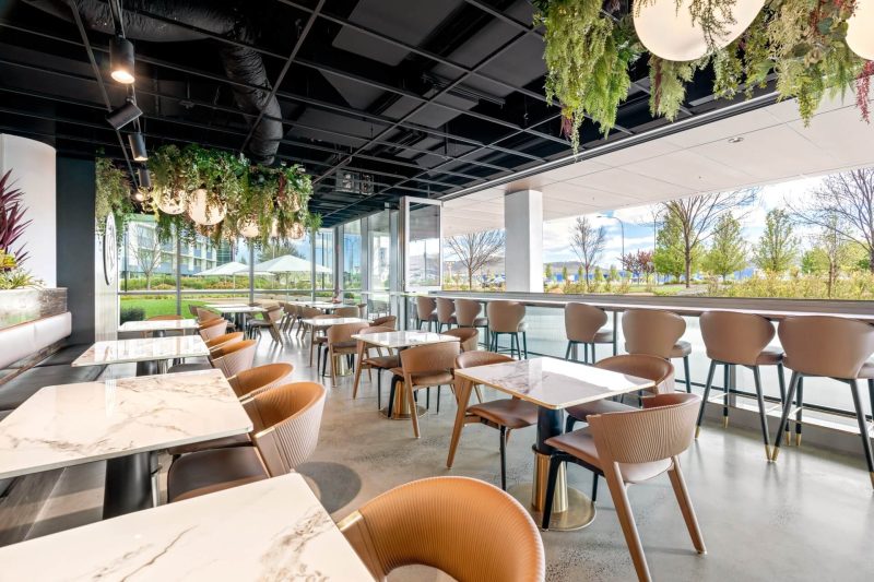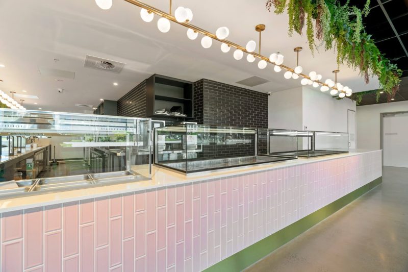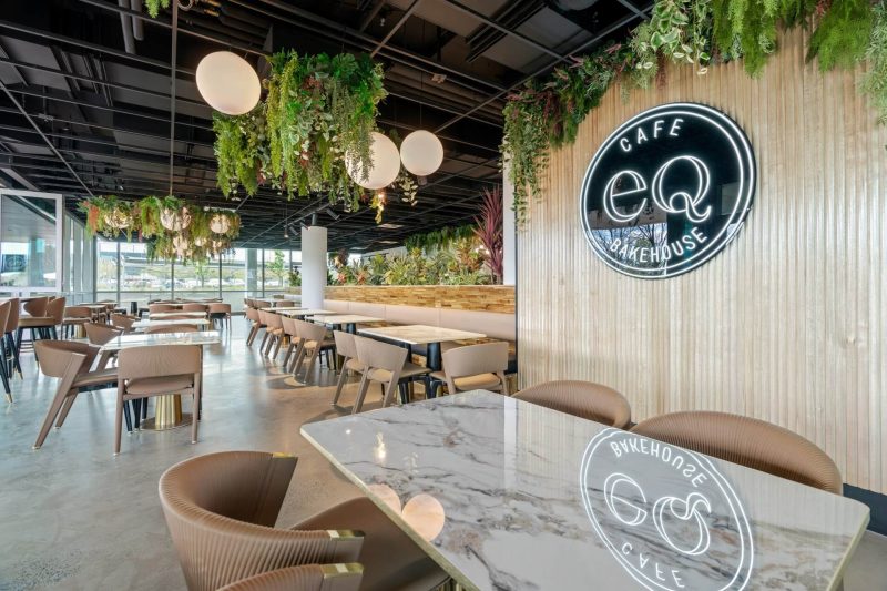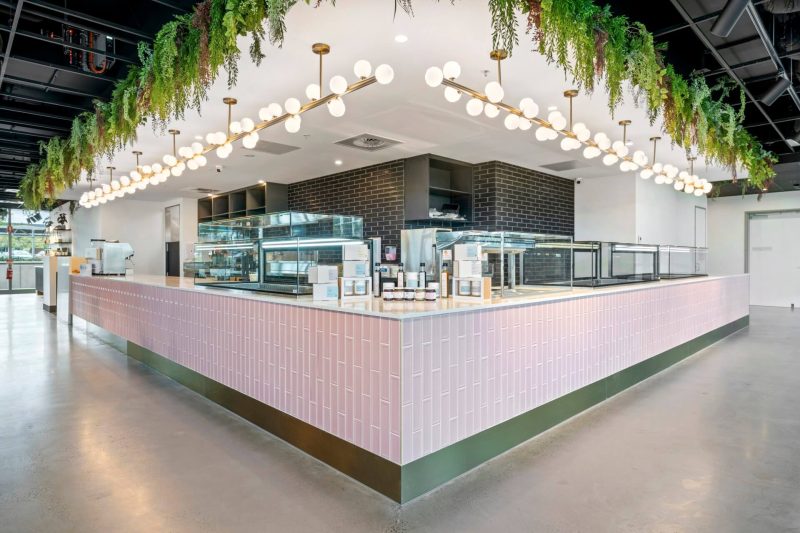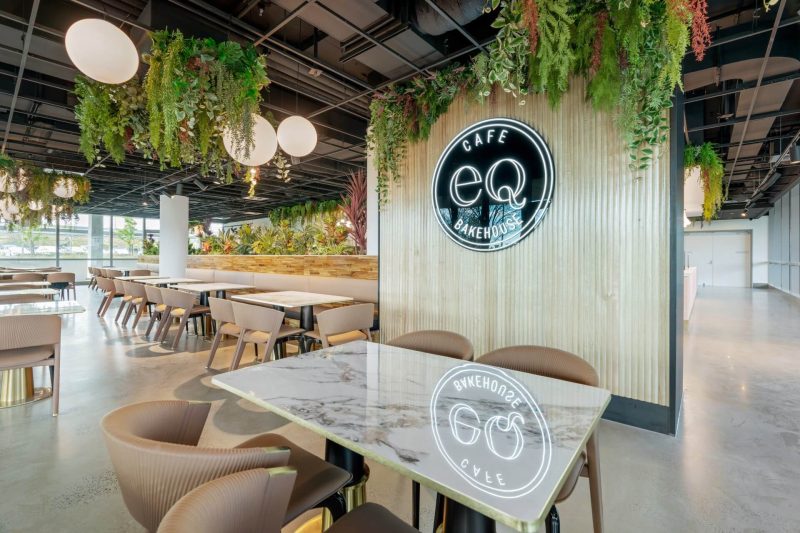 | The EQ bakehouse fit-out at majura business park, fairbairn delivers a light filled, garden inspired café within an award winning building for the canberra airport group. generous glazing and a strong connection to the landscape create a calm, welcoming environment suited to its business park setting. A layered ceiling of cascading greenery and soft globe pendants defines the dining space, while integrated planters and custom banquette seating subtly zone the interior. A refined palette of timber, marble look finishes and woven seating reinforces a relaxed yet polished brand identity. Rhe linear service counter, finished in blush toned brick pattern tiles, provides a clear visual anchor. this project marked the second eq bakehouse café for the client, further strengthening an ongoing collaboration through a consistent andrecognisable design language.