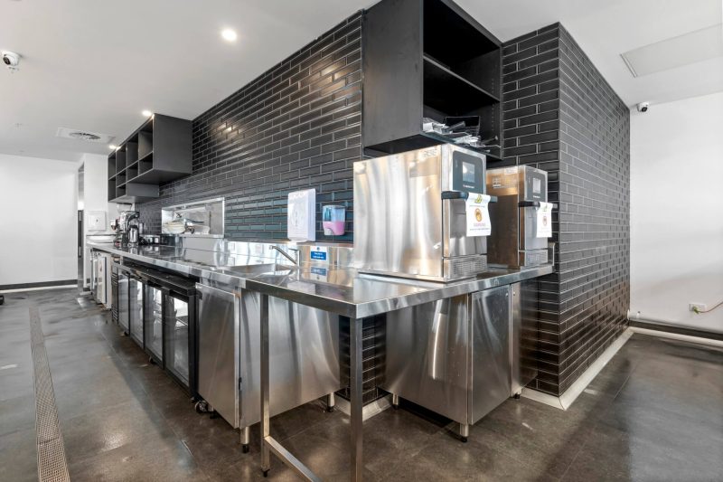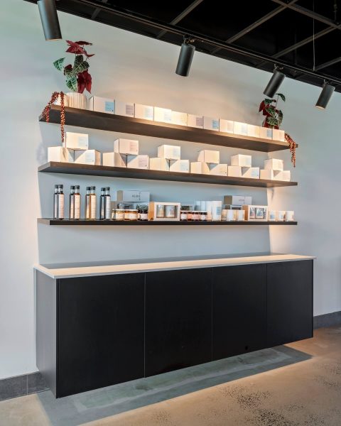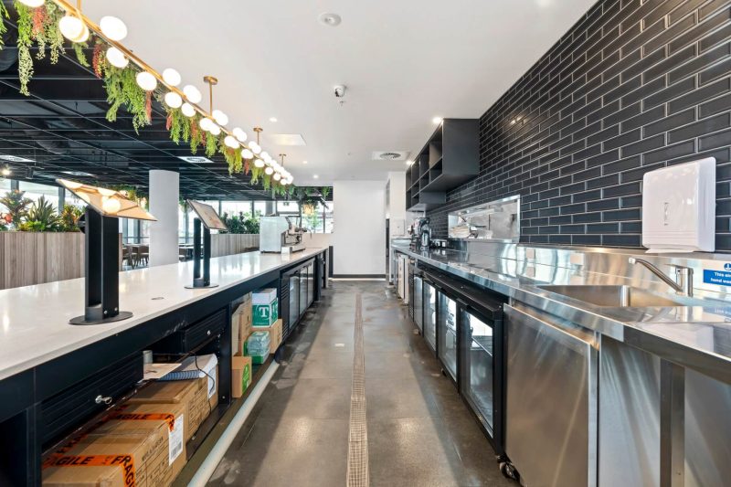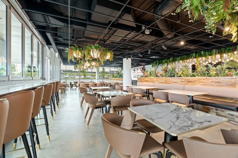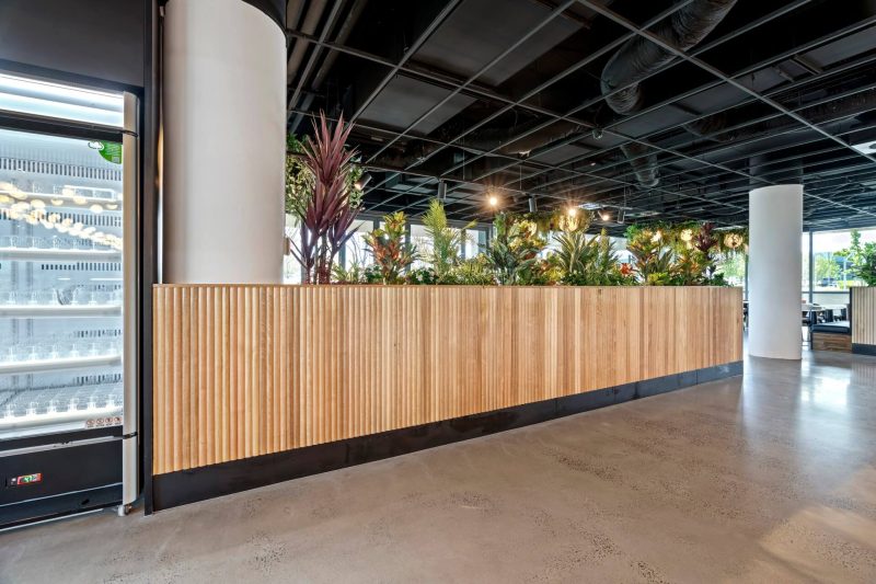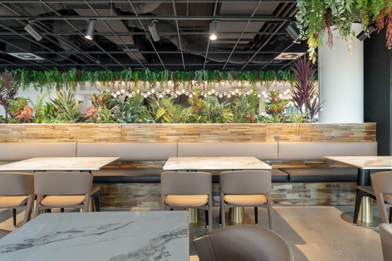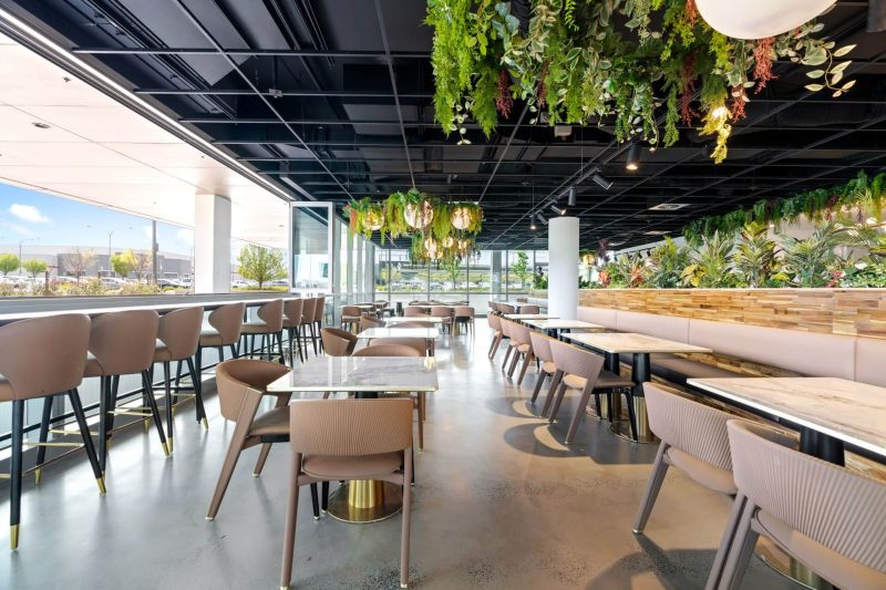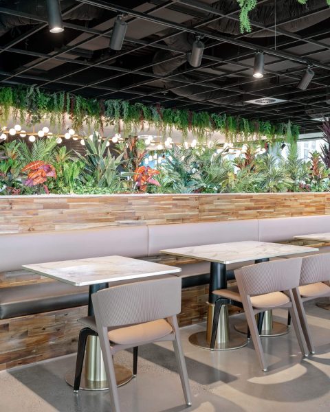 | The EQ bakehouse fit-out at majura business park, fairbairn delivers a light filled, garden inspired café within an award winning building for the canberra airport group. generous glazing and a strong connection to the landscape create a calm, welcoming environment suited to its business park setting. A layered ceiling of cascading greenery and soft globe pendants defines the dining space, while integrated planters and custom banquette seating subtly zone the interior. A refined palette of timber, marble look finishes and woven seating reinforces a relaxed yet polished brand identity. Rhe linear service counter, finished in blush toned brick pattern tiles, provides a clear visual anchor. this project marked the second eq bakehouse café for the client, further strengthening an ongoing collaboration through a consistent andrecognisable design language.